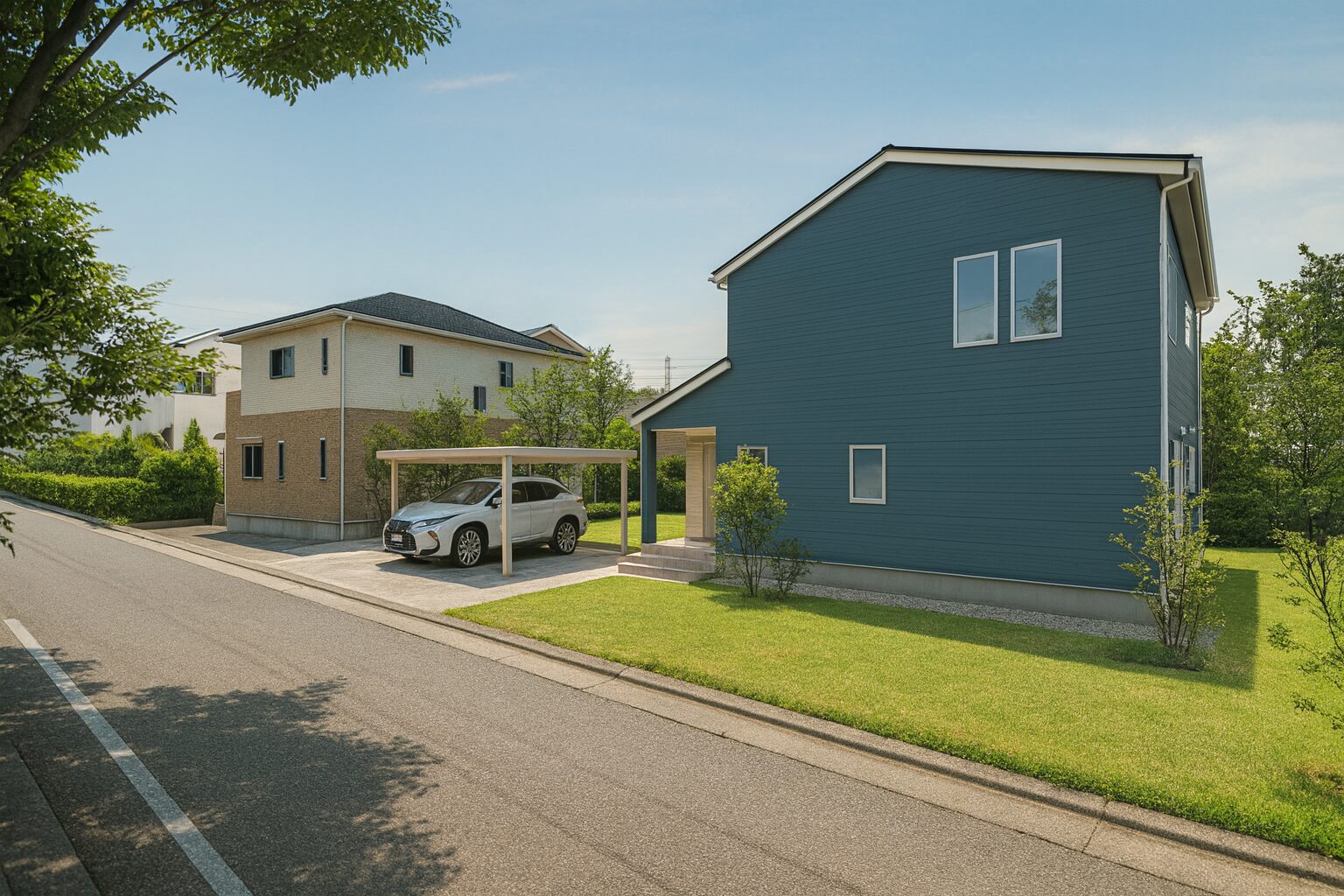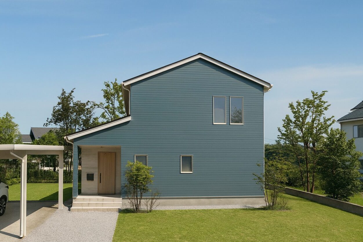 深いブルーの温もりが、穏やかな存在感を生み出し、広がる庭と空が、毎日にゆるやかな余白をつくる。長く暮らすほど、心にしっくり馴染んでいく外観。