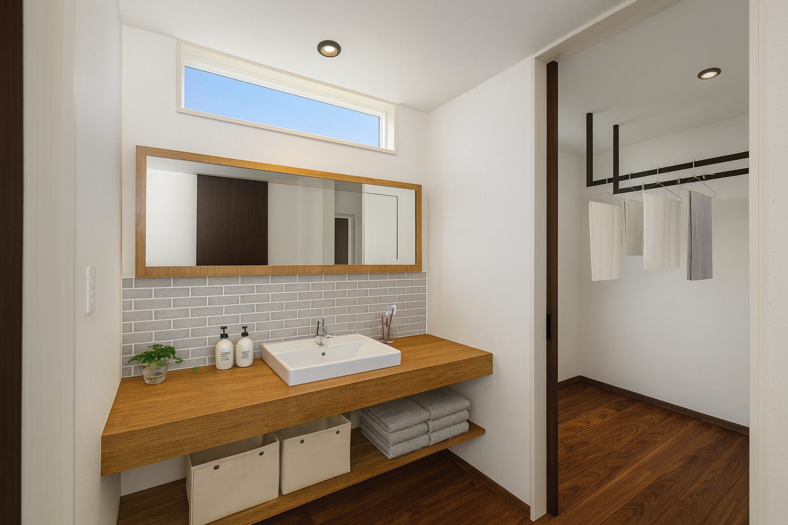 洗面とランドリールームがつながる動線で、“済ませる”だけの作業が、暮らしの流れへと変わっていく。忙しい日も、ふと深呼吸したくなるような空間に。