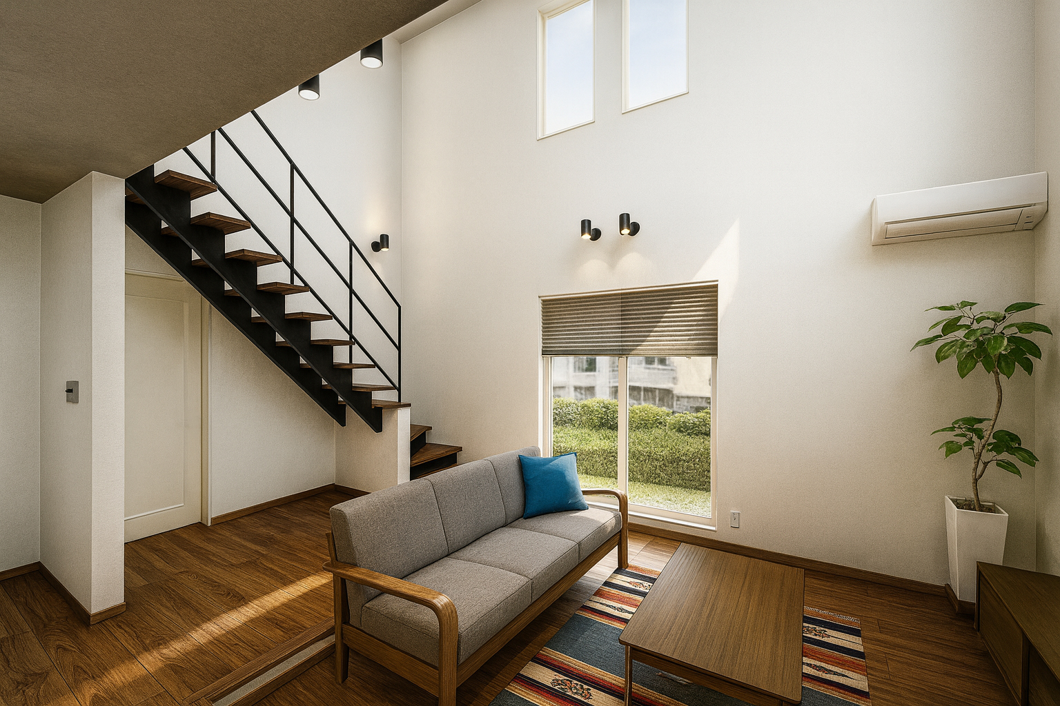高い天井と大きな窓が光を迎え入れ、空間に余白をつくりながらも、どこか安心できる温度がある。ただ座っているだけで、気持ちが静かに整っていくリビング。
