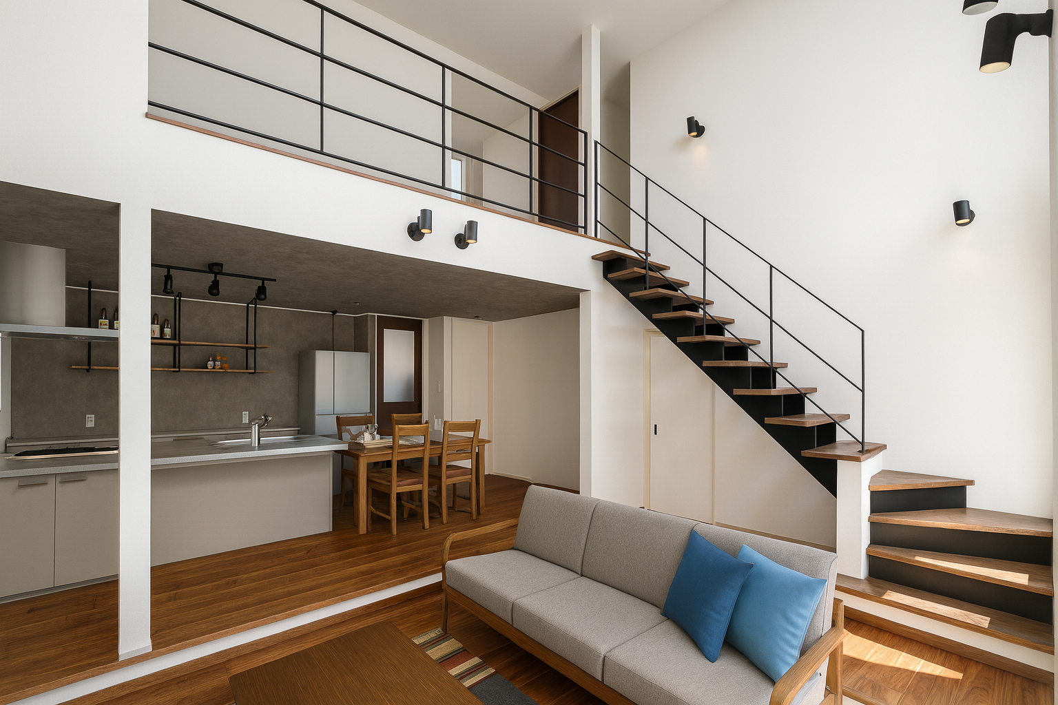吹き抜けの伸びやかな明るさと、ダイニングの低い天井の安心感。この絶妙なバランスが、暮らしのリズムをやさしく整えてくれる。そんな“ちょうどよさ”が息づく住まいです。