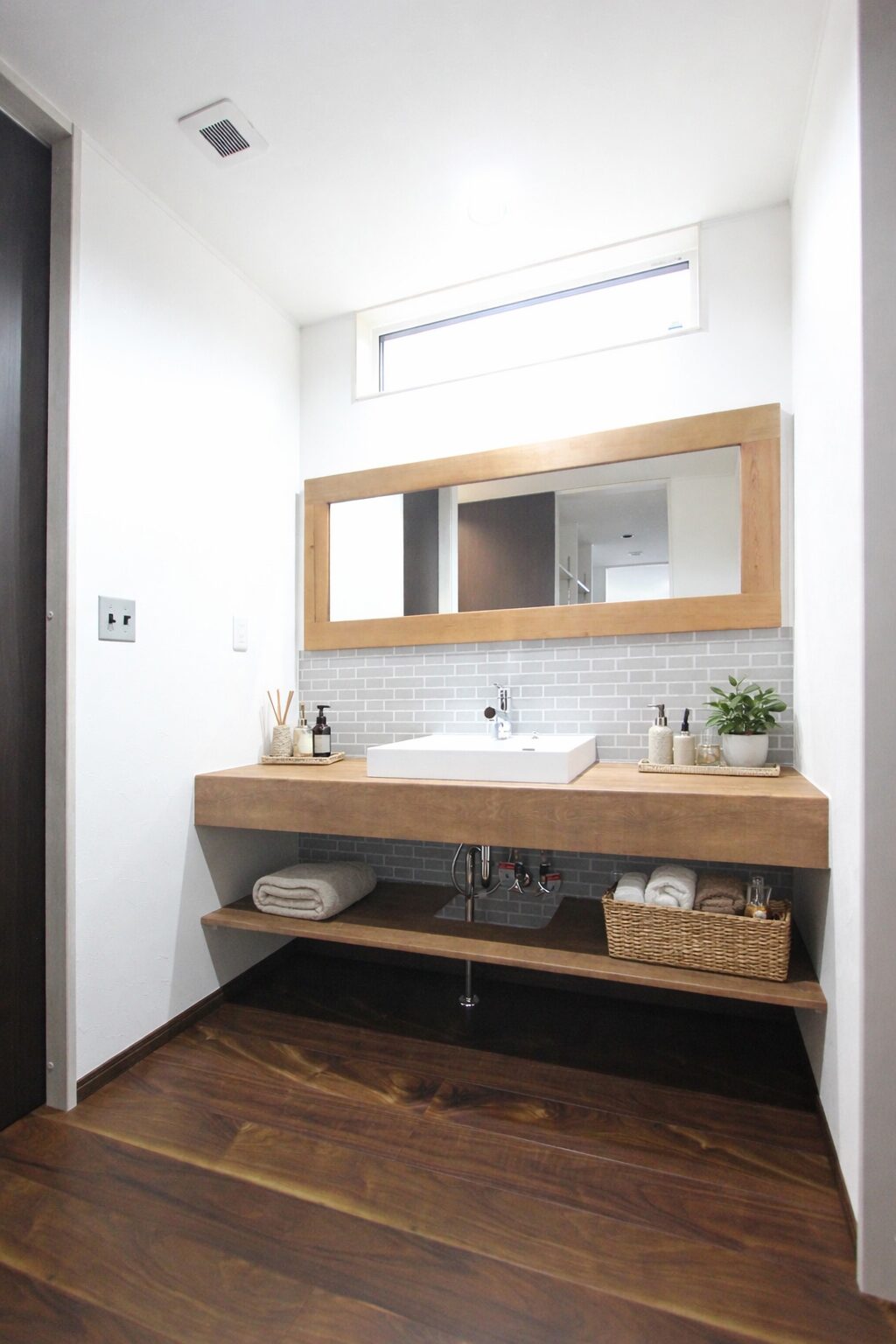 造作カウンターとタイルを組み合わせた、落ち着きのある洗面。横長のミラーと高窓で、明るさと奥行きを感じられます。下部のオープン棚で、タオルや日用品もすっきり収納。