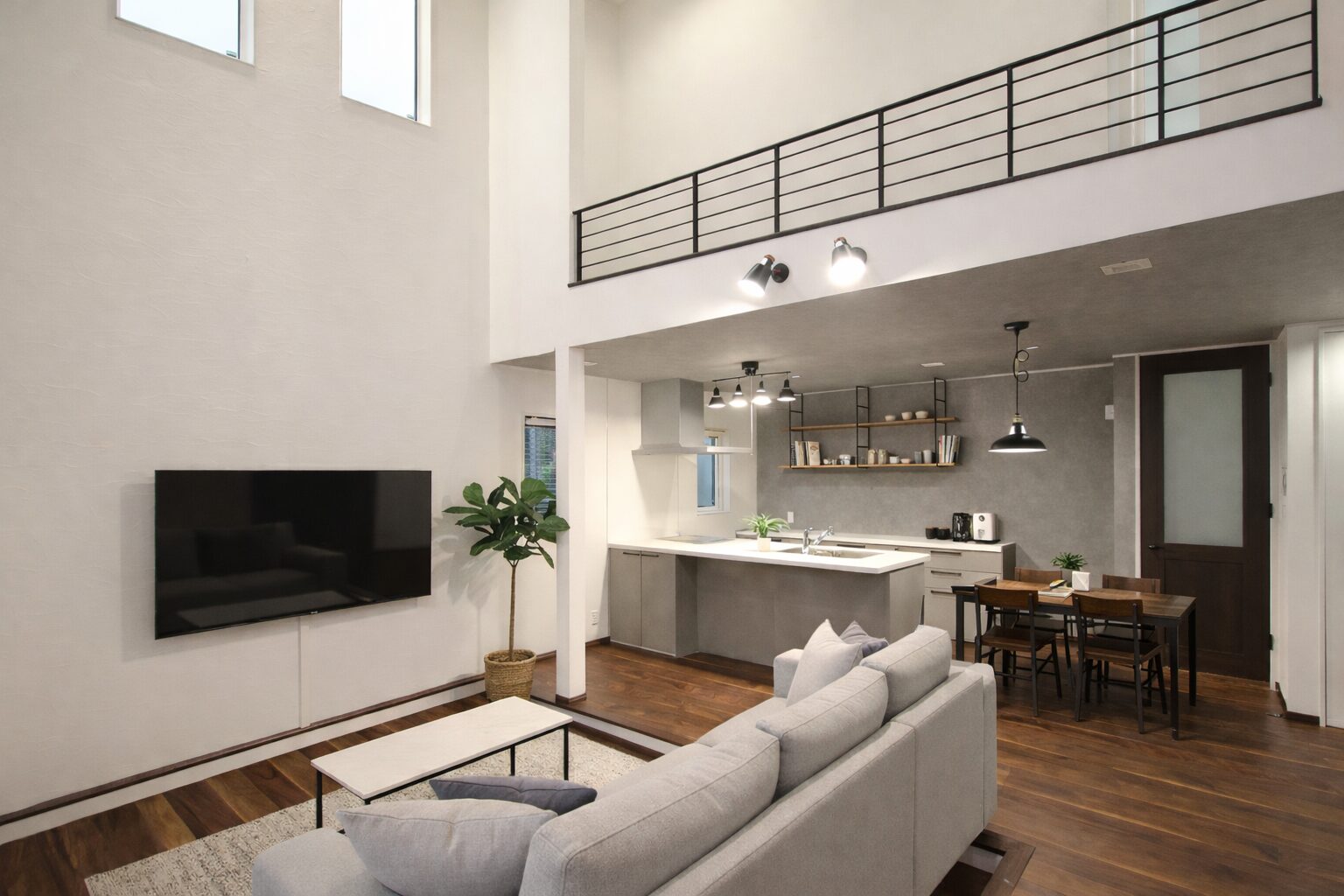 吹き抜けが生み出す、縦に広がる開放感。一段下げたリビングが、空間にほどよい“こもり感”をつくります。高さと奥行きのコントラストが、LDK全体にメリハリを与えます。