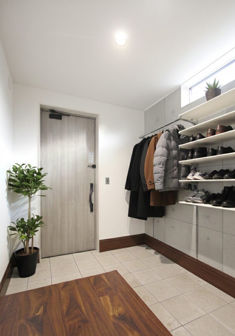 土間を広く確保した、ゆとりのある玄関スペース。可動棚とハンガーパイプで、靴もアウターもまとめて収納できます。高窓からの自然光で、玄関全体が明るく感じられます。