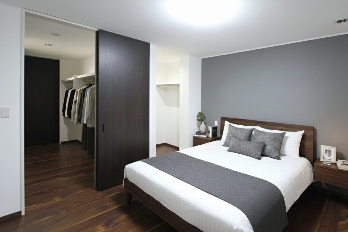 1階に配置した、生活動線に配慮した主寝室。ファミリークローゼットとウォークインクローゼットに直接つながり、身支度や片付けがスムーズです。移動を最小限に抑えた動線が、暮らしの負担を軽くします。