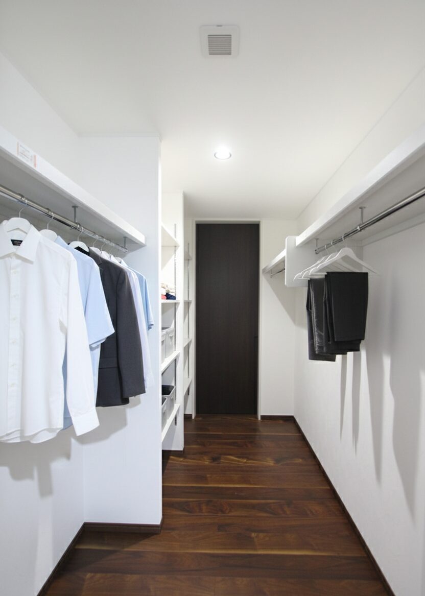左右に収納を分けた、通路幅にゆとりのあるファミリークローゼット。衣類をまとめて管理でき、季節替えや日々の片付けもスムーズです。主寝室とつながる配置で生活動線にも配慮しています。
