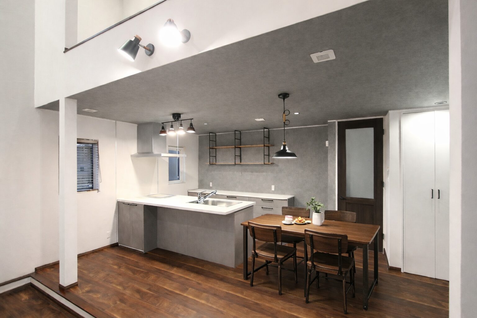 キッチンと横並びで使える、コンパクトなダイニング配置。グレーを基調にした内装と木の床が、落ち着いた雰囲気をつくります。照明と吊り棚で、空間にほどよいアクセントをプラス。