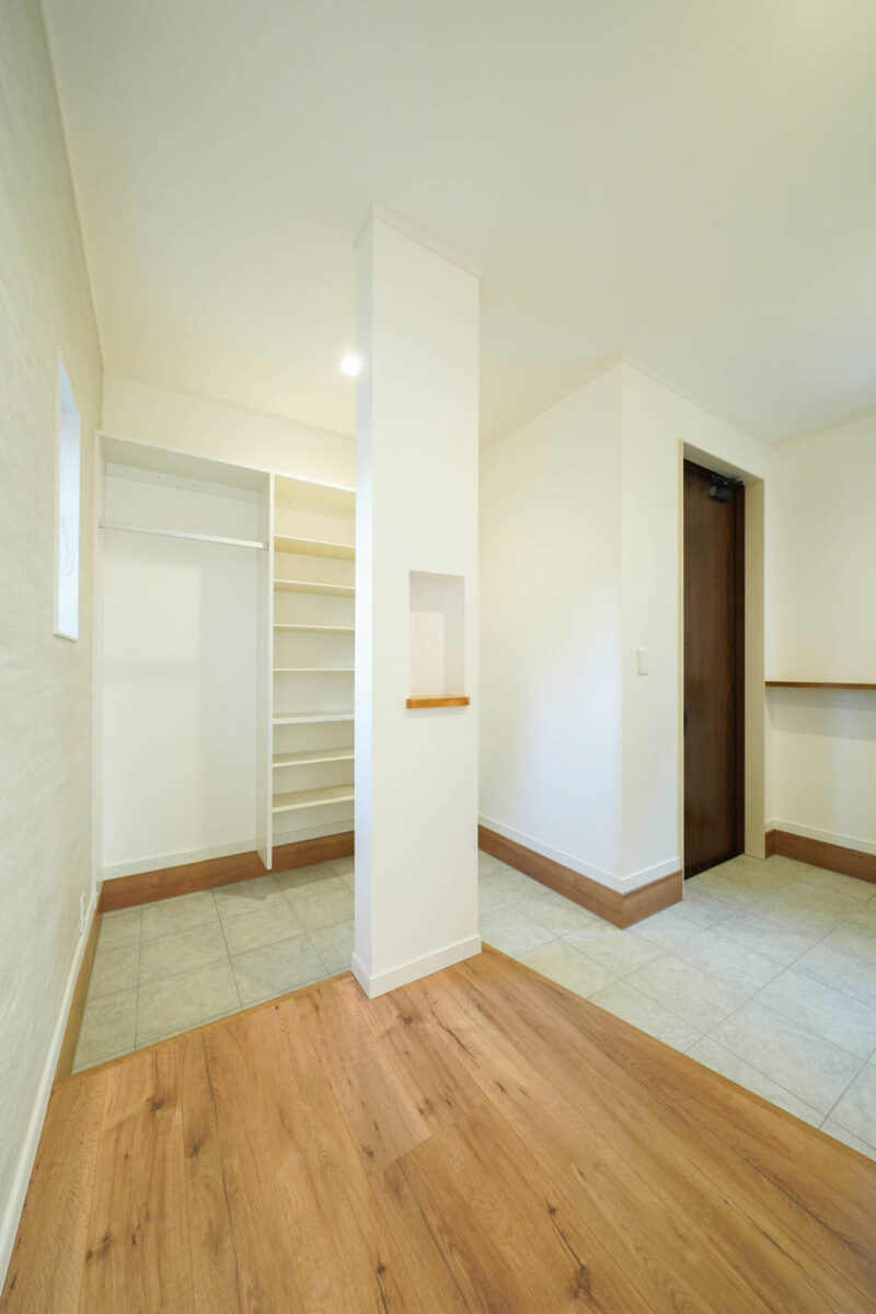 土間が奥まで繋がっているため、靴を脱がずにコートを掛けたり荷物をしまえたりと、毎日の帰宅動線が非常にスムーズです。