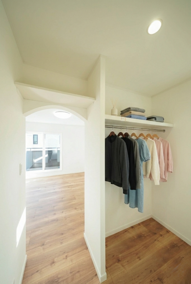 主寝室からつながる収納力抜群のウォークインクローゼットは、アーチの垂れ幕で可愛らしく演出。