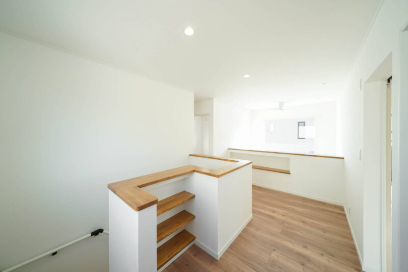 階段を上がった2階のホールには、家族みんなで使える収納棚を設けました。