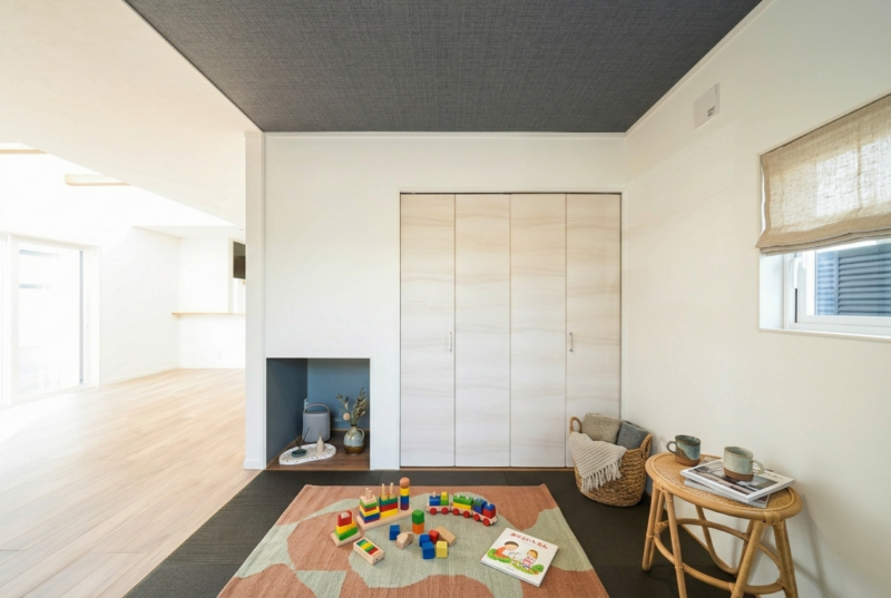 畳コーナーには、扉付きの大きな収納を。