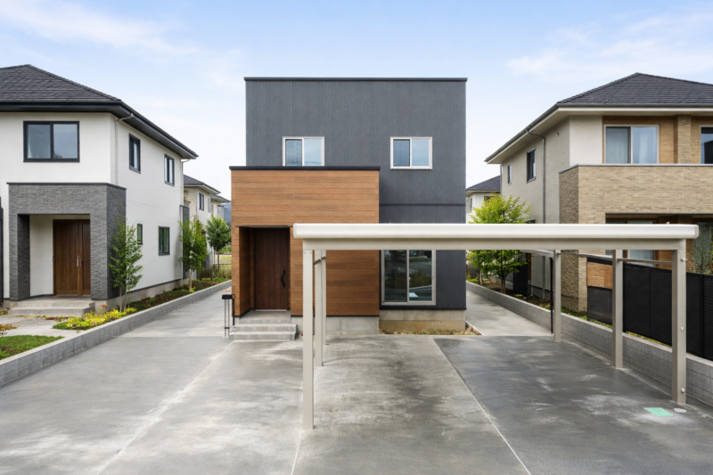 落ち着いたダークトーンに玄関ポーチの木目柄が映える、モダンな外観デザイン。
