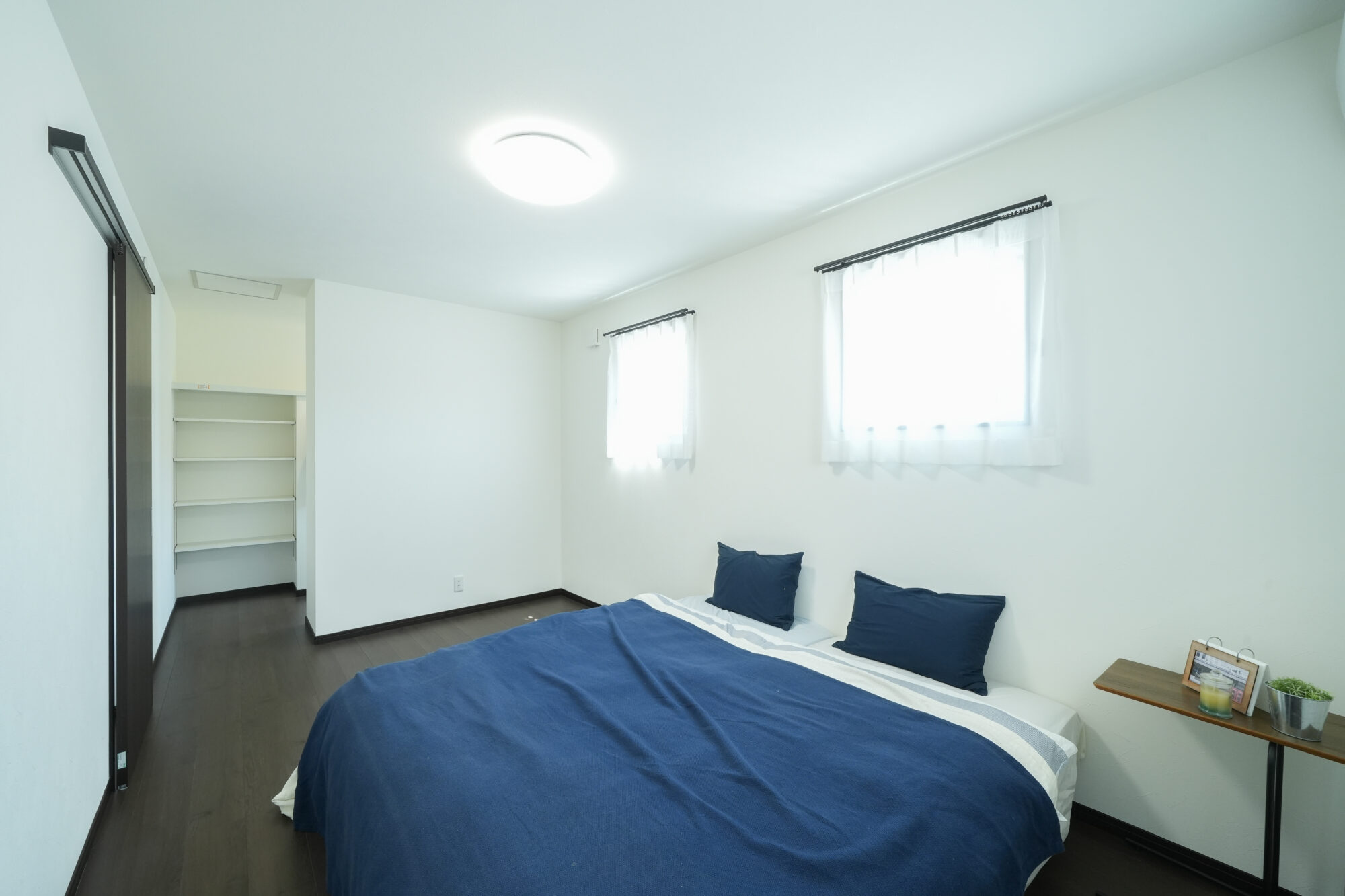 奥には収納スペースを設け、寝室まわりをすっきり保てるようにしました。