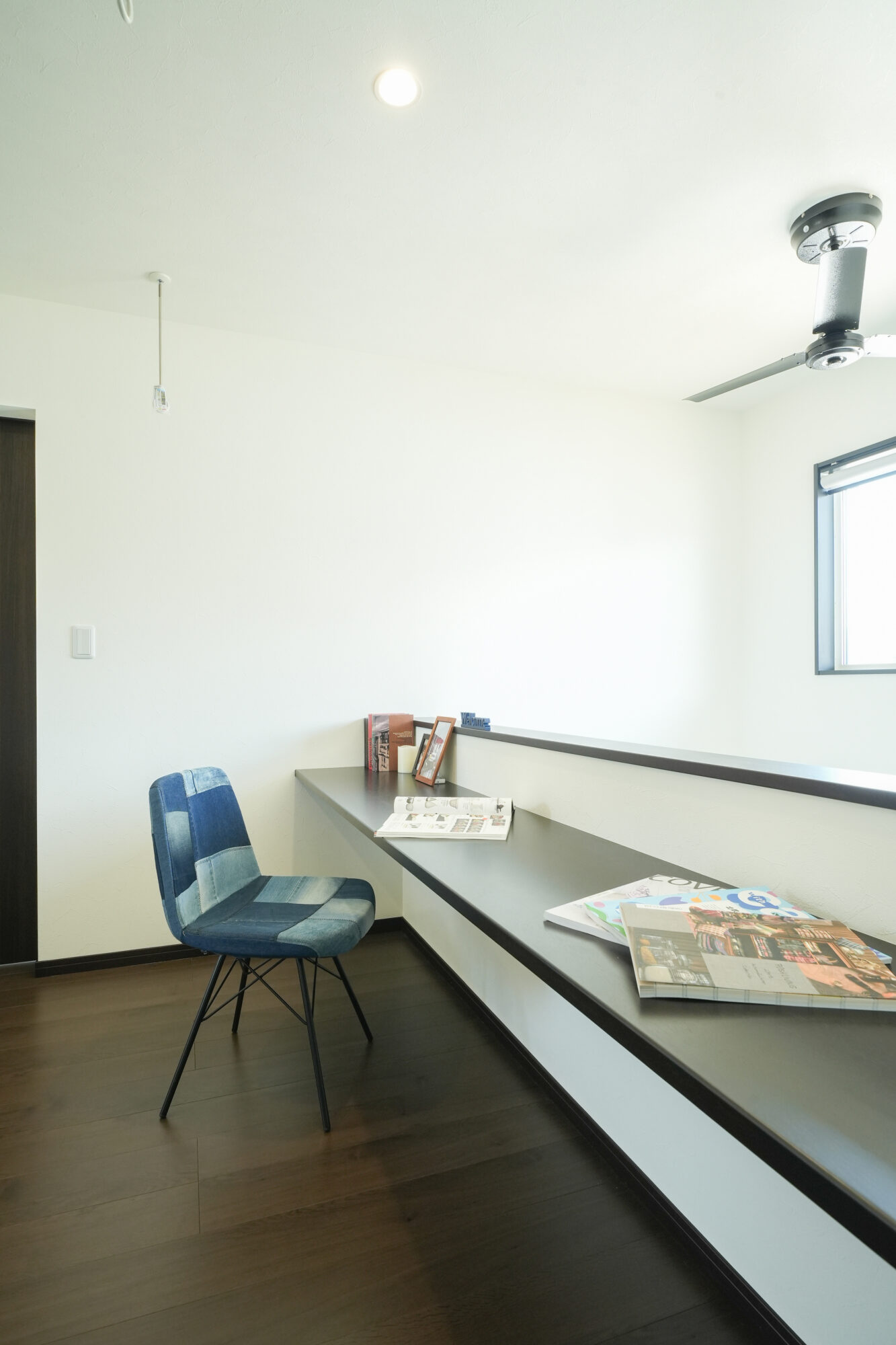 2階ホールに設けた、カウンター付きのワークスペース。作業や読書など、気軽に使える場所として活躍します。