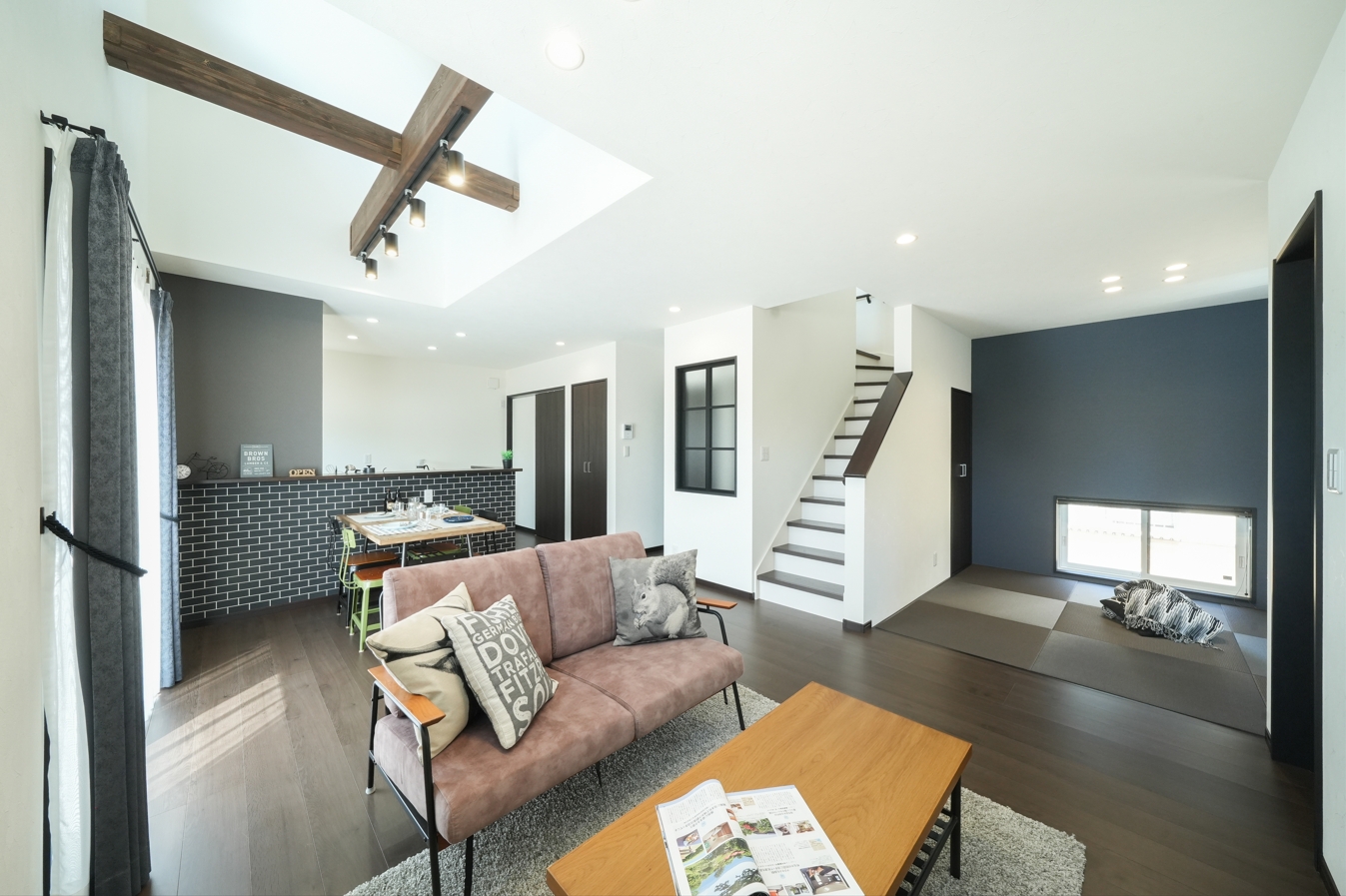 リビング・ダイニング・和室がつながる、開放感のあるLDK。吹き抜けと梁見せで、空間全体に明るさと広がりを感じられます。