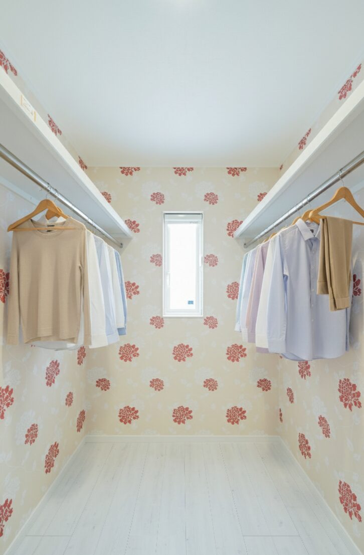 花柄クロスが空間のアクセントとなり、可愛らしさを感じられる収納スペースです。