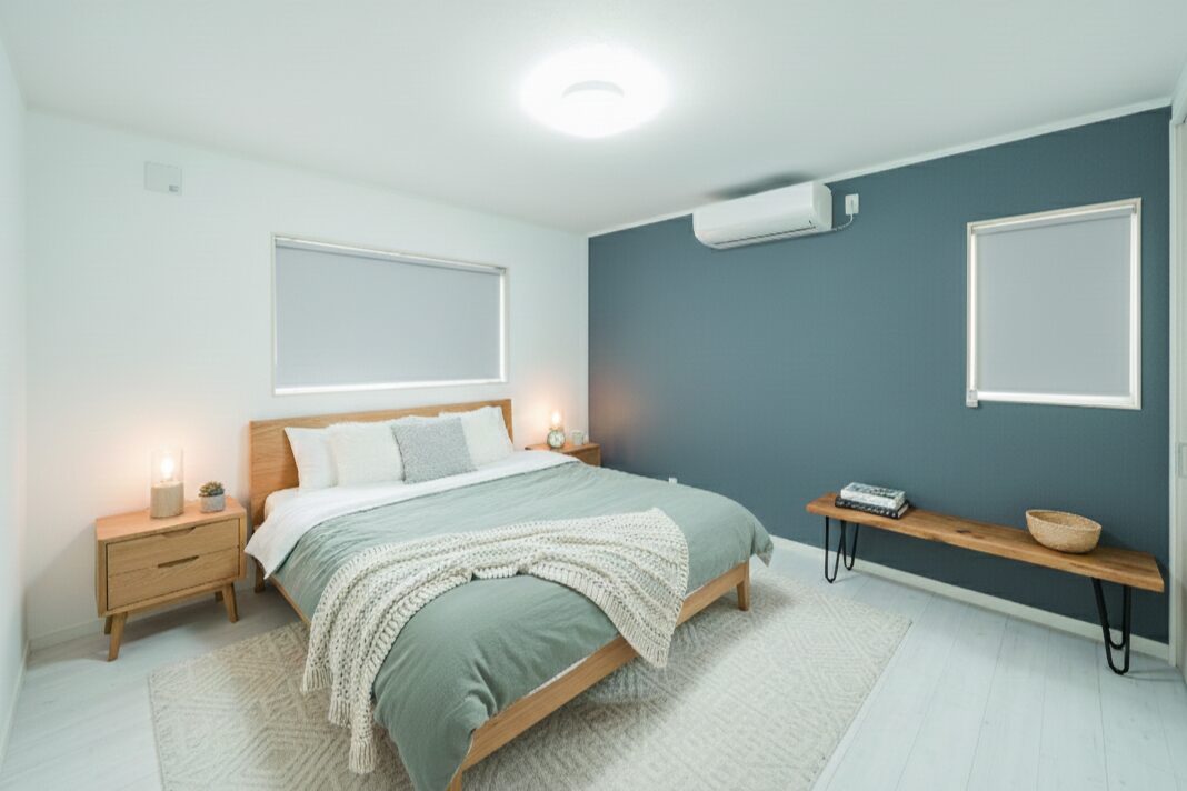 落ち着いたブルーのアクセントクロスが、空間にほどよい安らぎをもたらします。