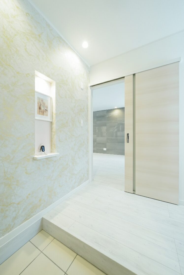大理石調のアクセントクロスが、玄関に上品な印象をもたらします。