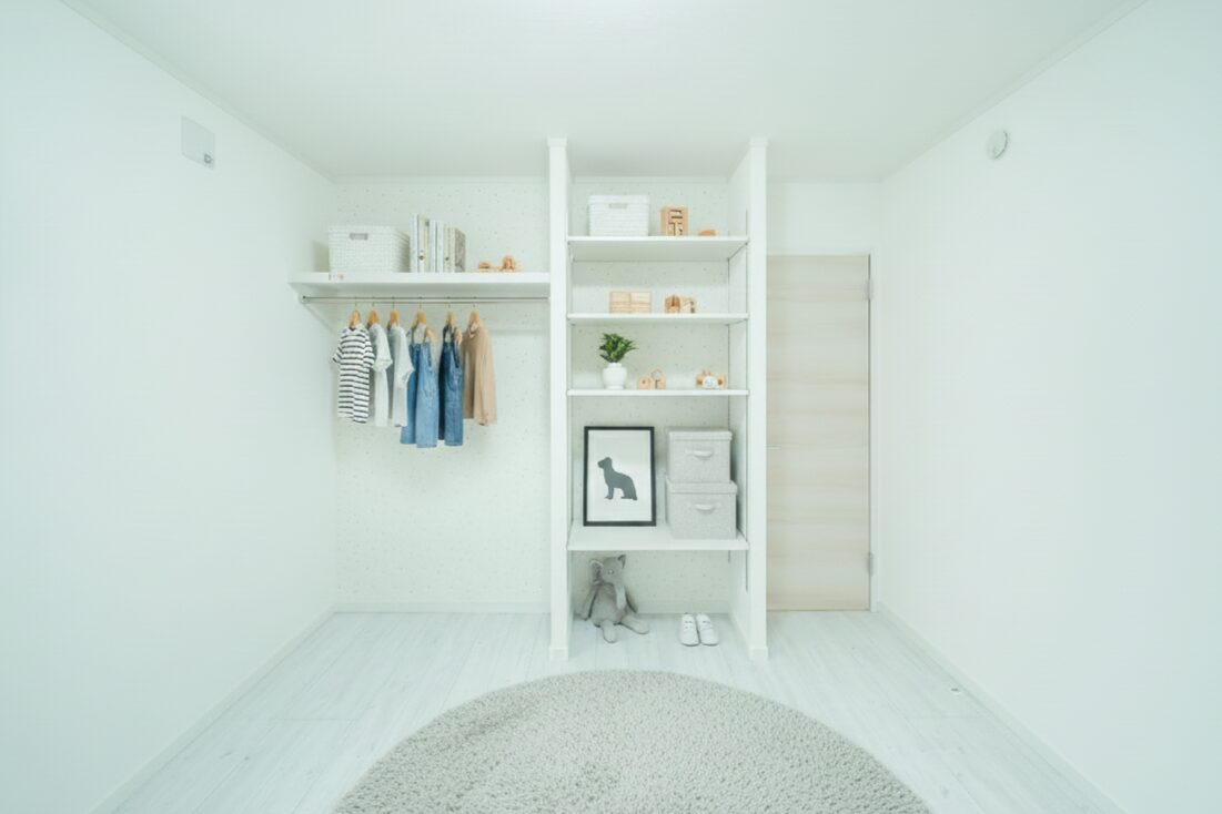 白を基調としたやわらかな子ども部屋には、可動棚とハンガーパイプを設けました。