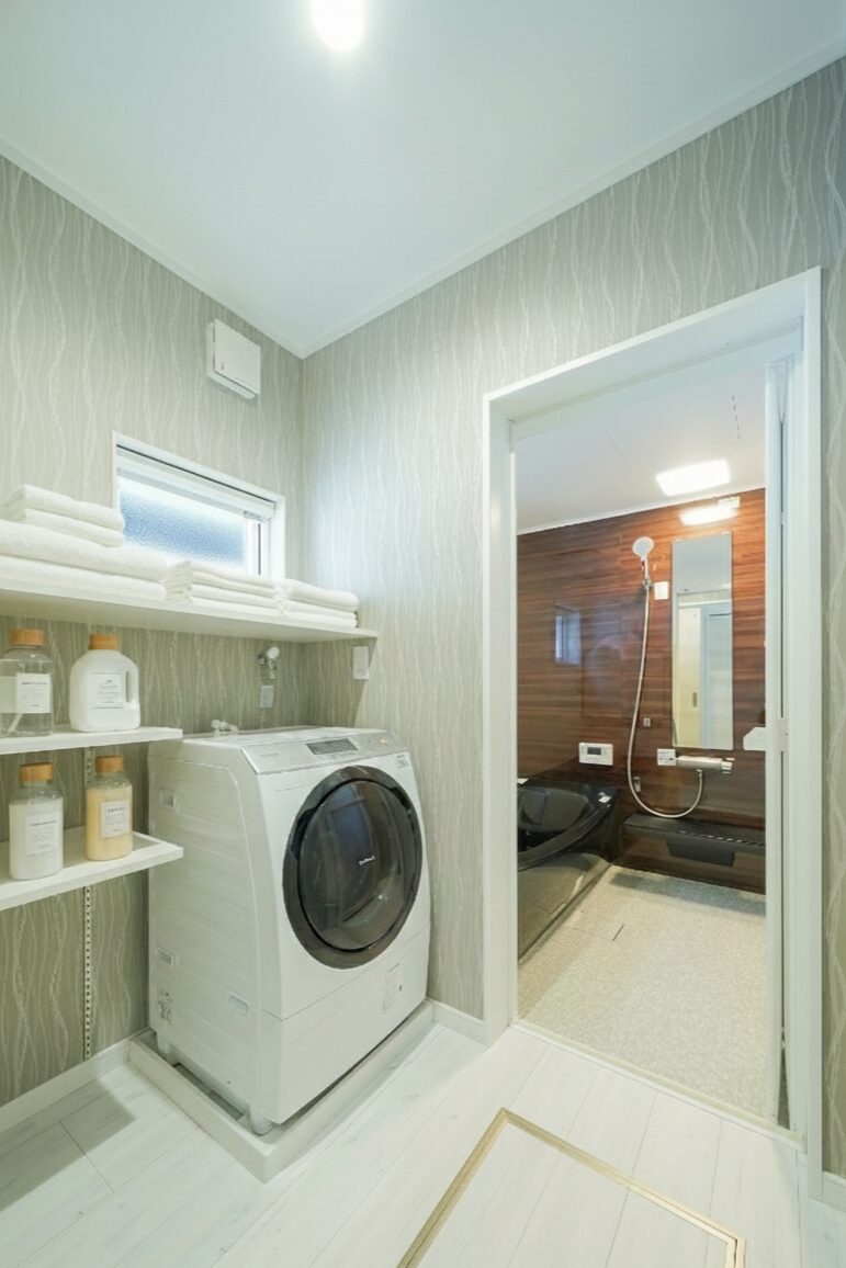 清潔感のある明るい脱衣室は、可動棚付きでタオルや洗剤の収納にも便利です。