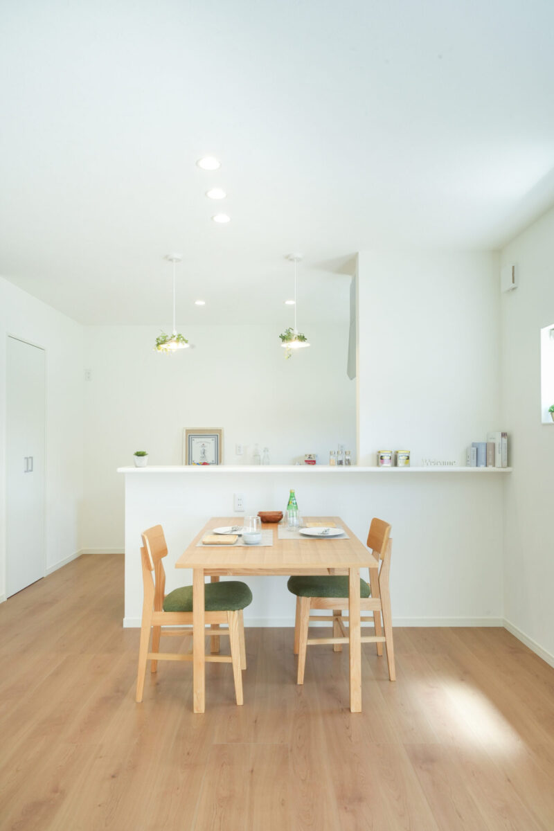 壁一面の白が外からの光を柔らかく反射し、LDK全体を明るく開放的な雰囲気で包み込みます。