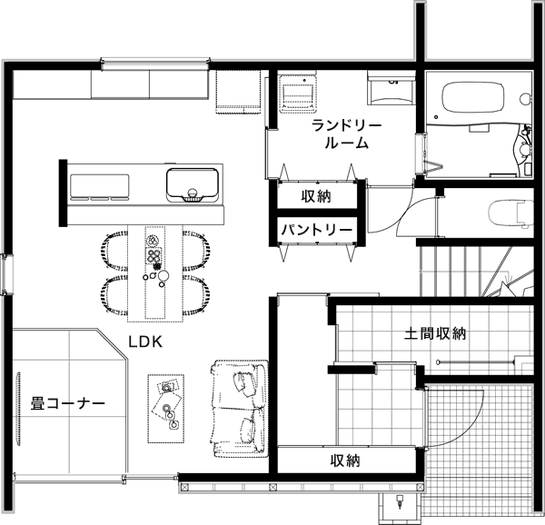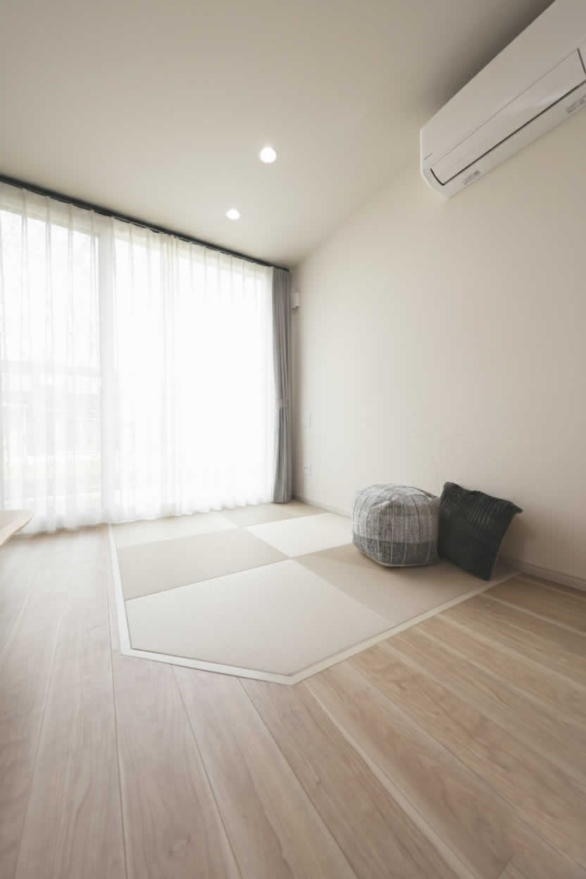 LDKの一角に設けたタタミコーナーは、家事の合間の休憩や子供の遊び場にもぴったり。家族が自然と集まる、心落ち着く空間です。