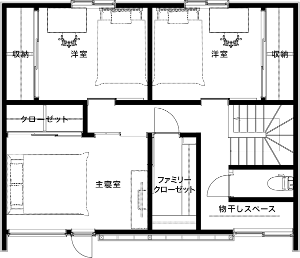 2階にあるファミリークローゼットは、家族の衣類や荷物をまとめて収納でき、整理整頓や家事の効率アップに役立ちます。